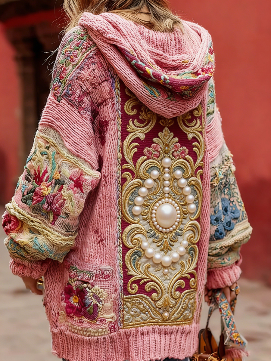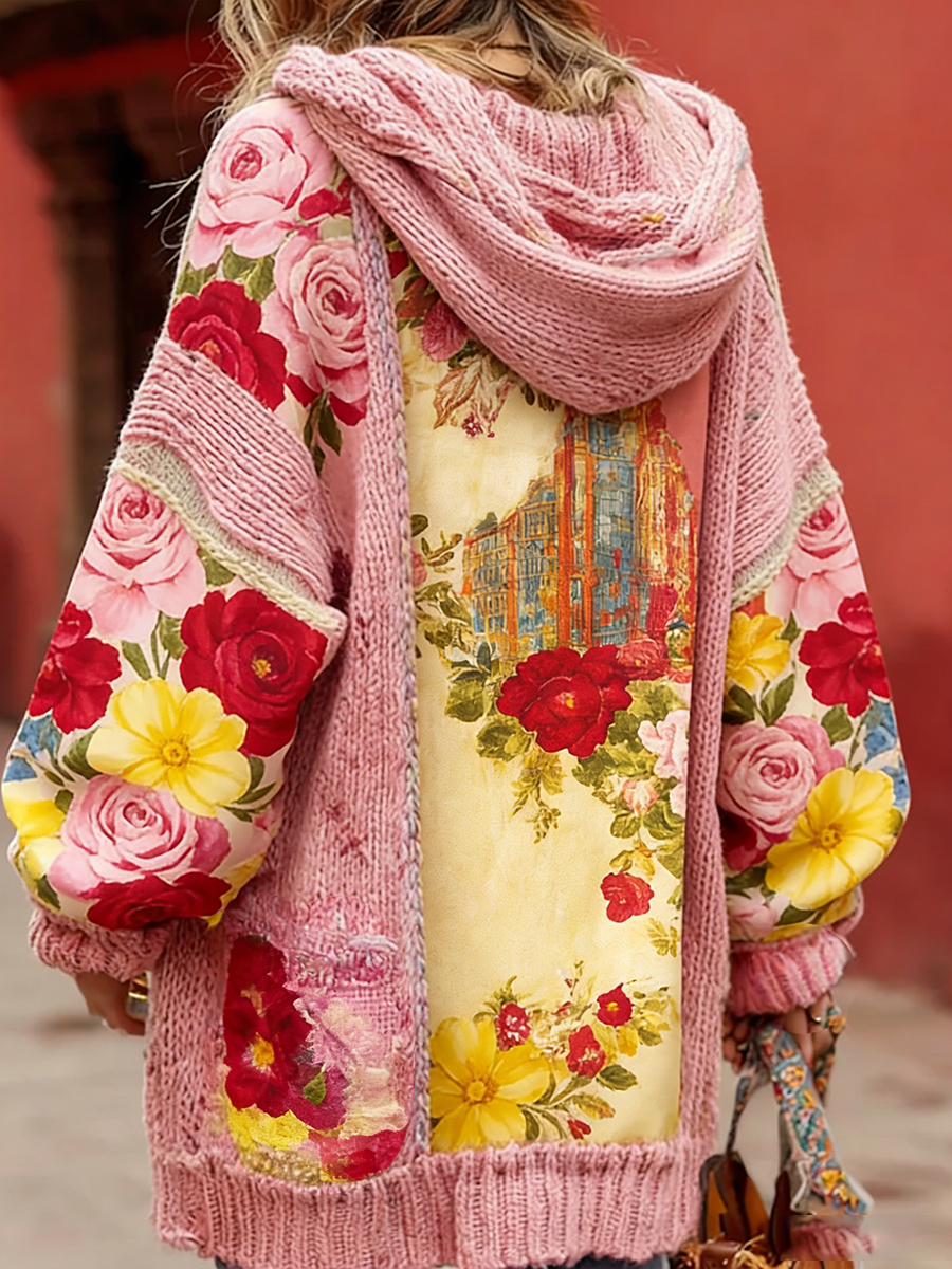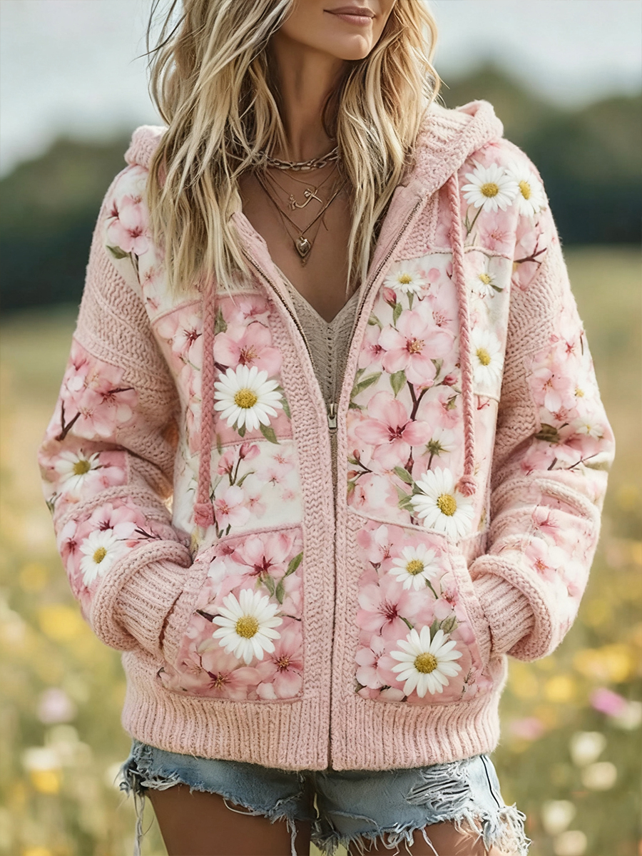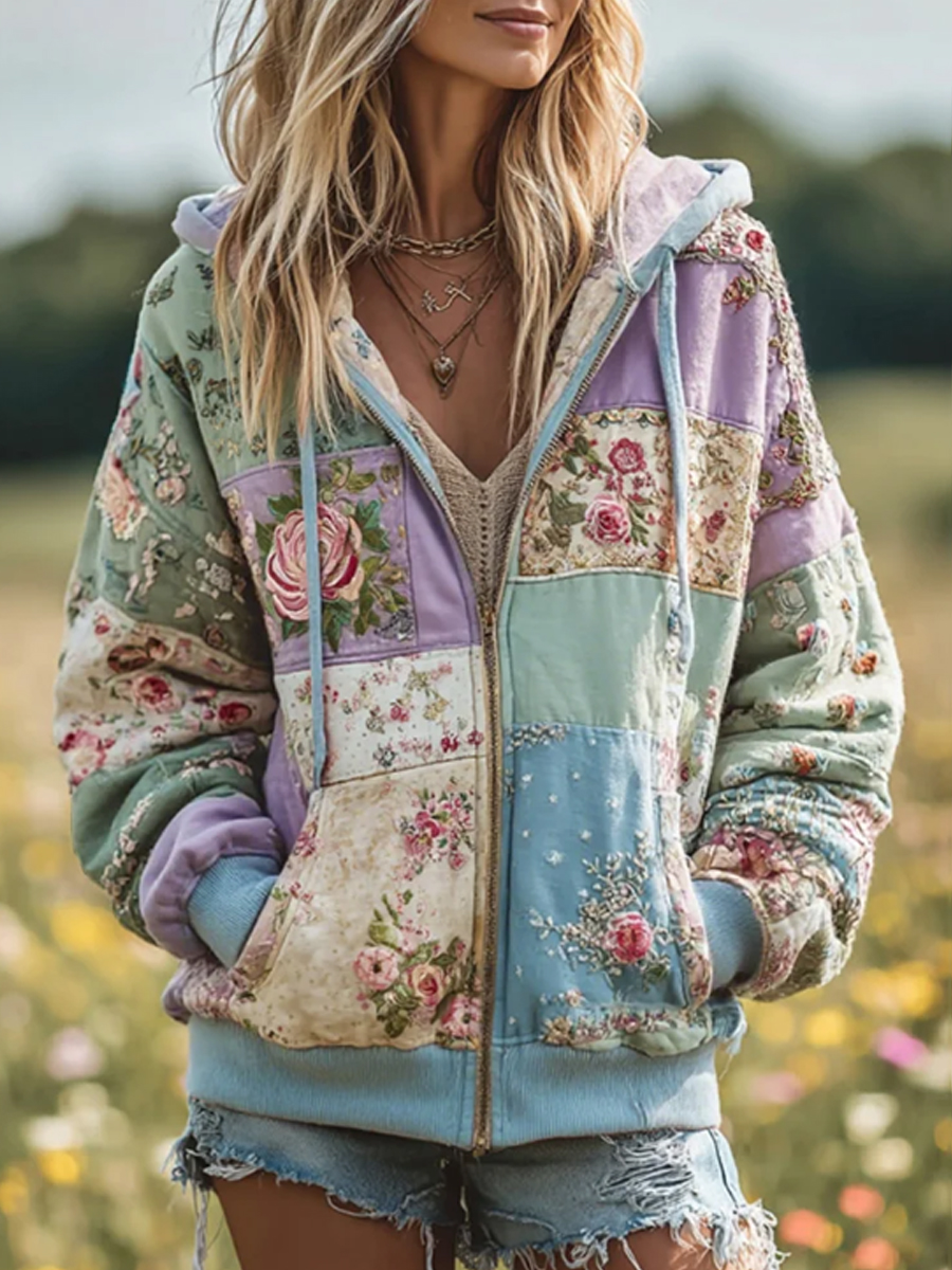 Dames vintage bloemen patchwork Gezellige hoodie met warme rits