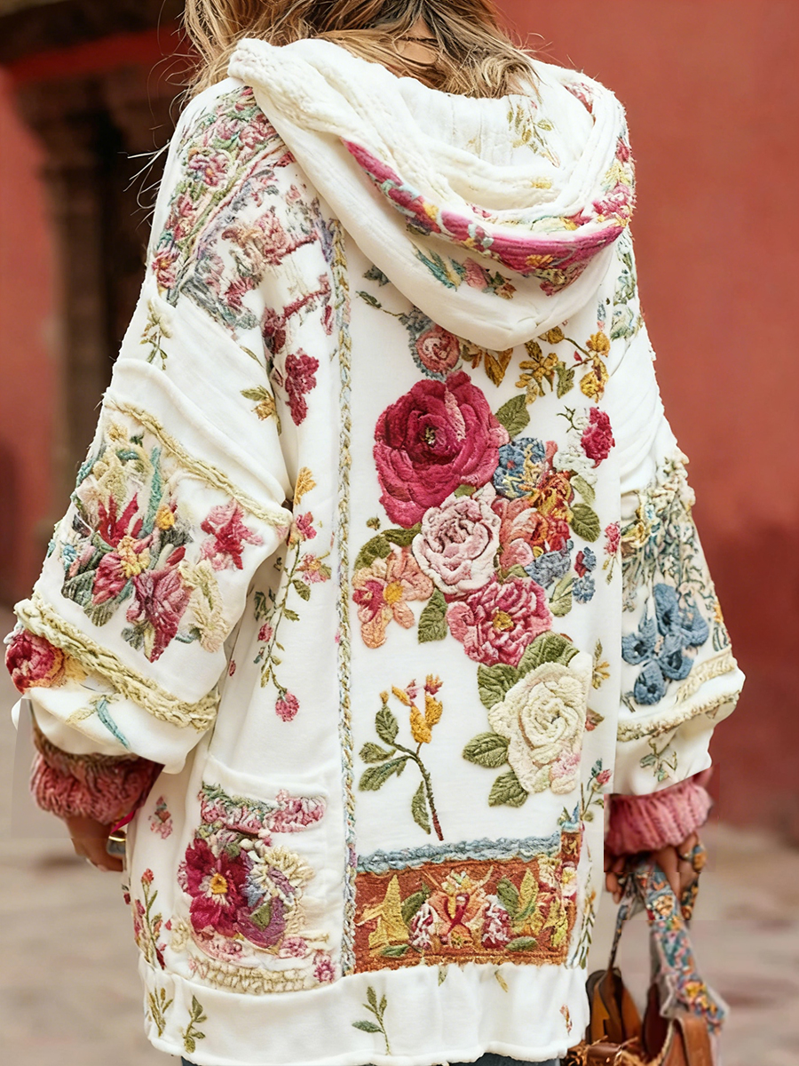 Dames vintage bloemen patchwork Gezellige hoodie met warme rits