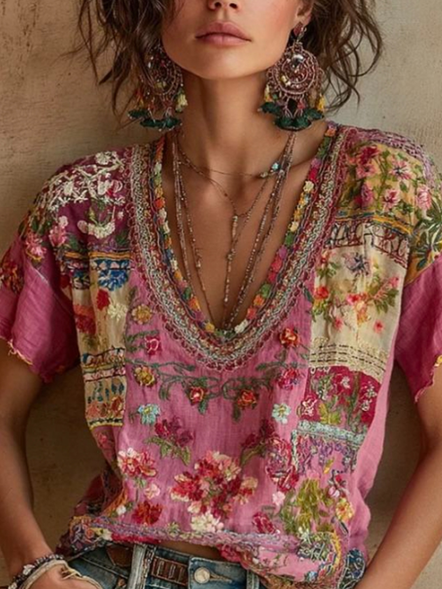 Dames Boheemse bloemen borduurwerk kunst contrast kleur linnen blend T-shirt