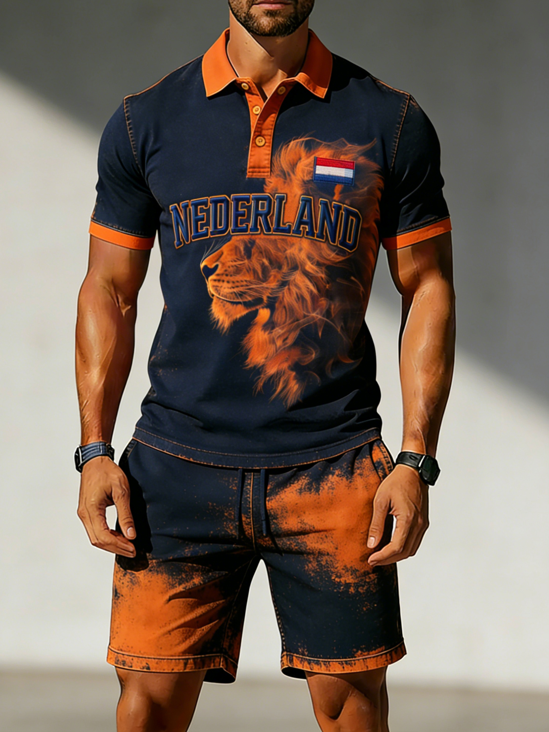 Herenpolo en shortsset met grafische print van de Nederlandse vlag, casual stylerei