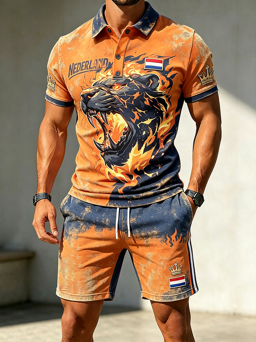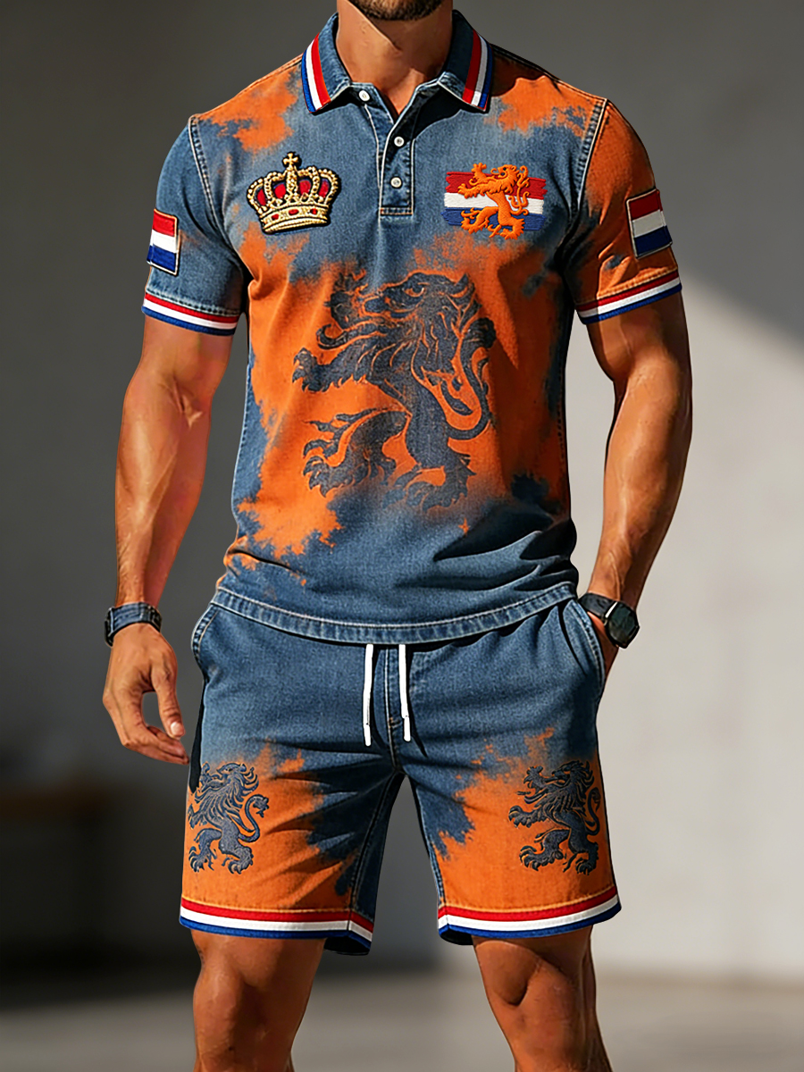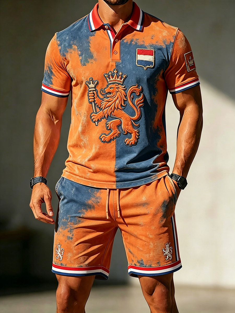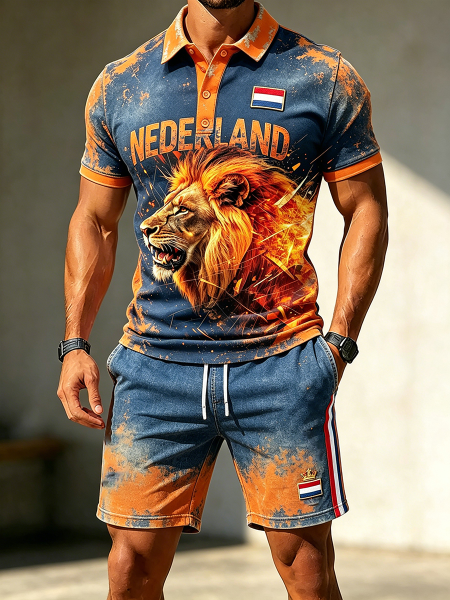 Herenretro poloshirt en korte broekset met leeuw voor Koningsdag, casual style