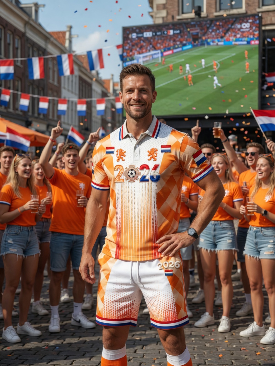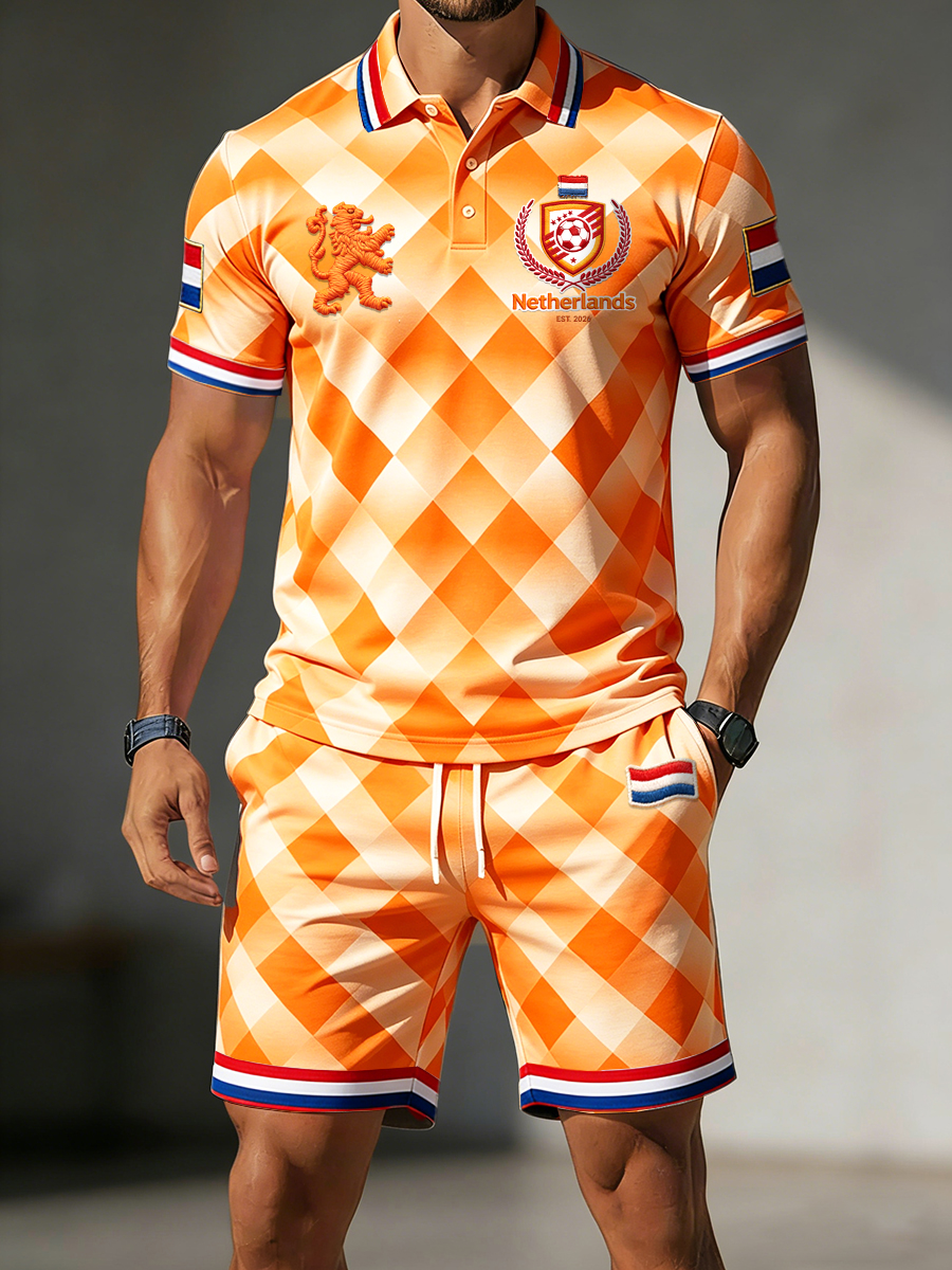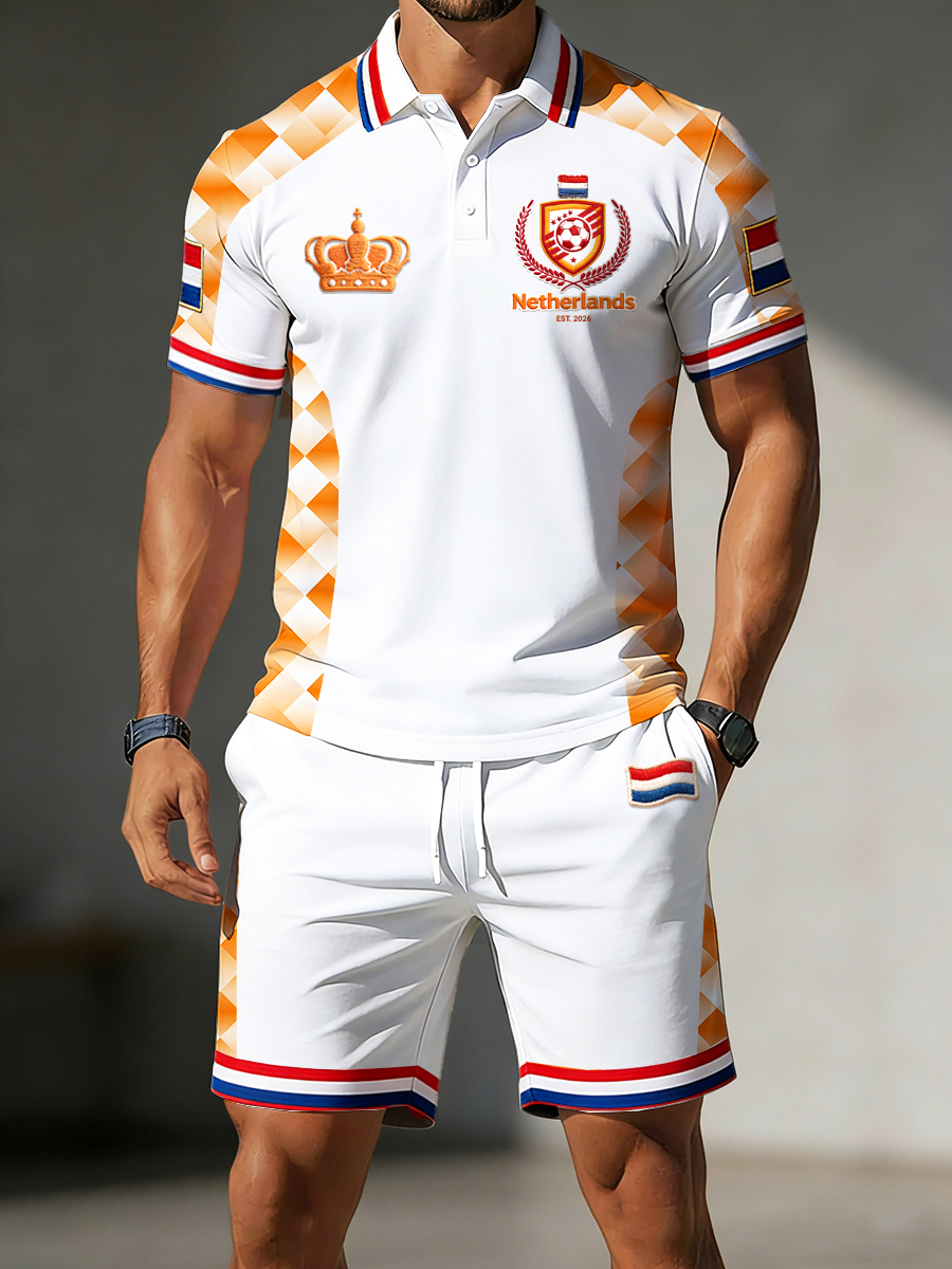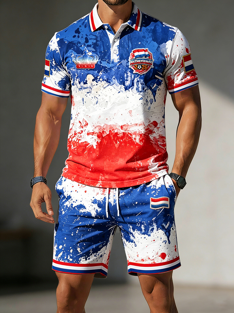 Heren Nederland 2026 voetbal patchworkprint casual poloshirt en korte broek set
