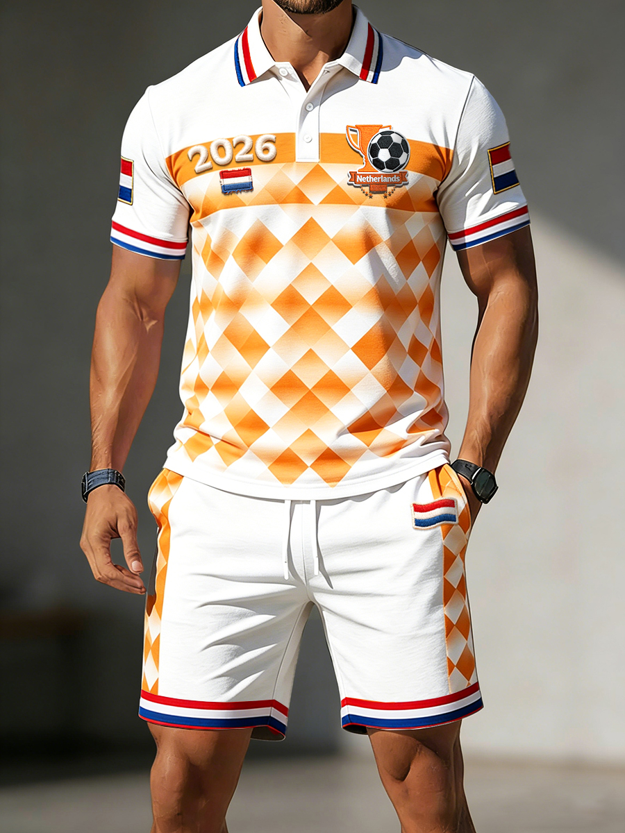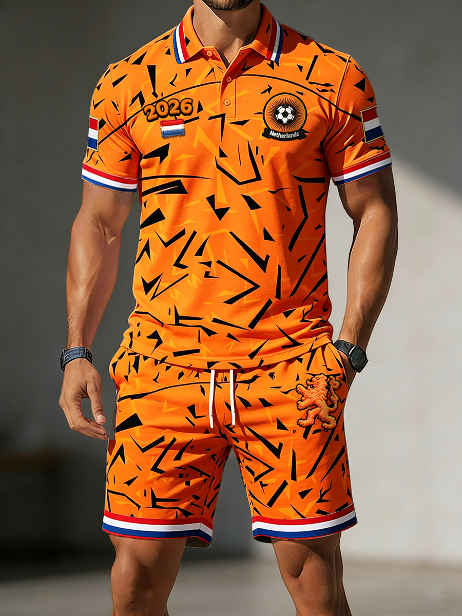 Heren Nederlandse vintage geometrische voetbalprint casual poloshirt en korte broek set 2026
