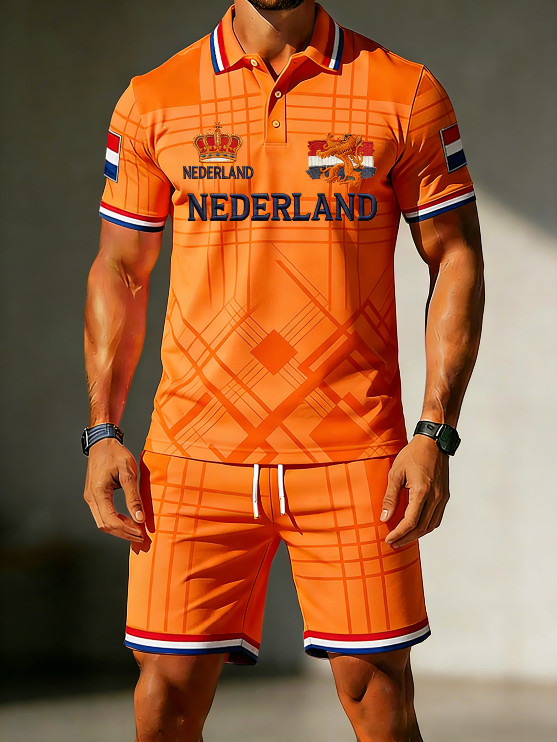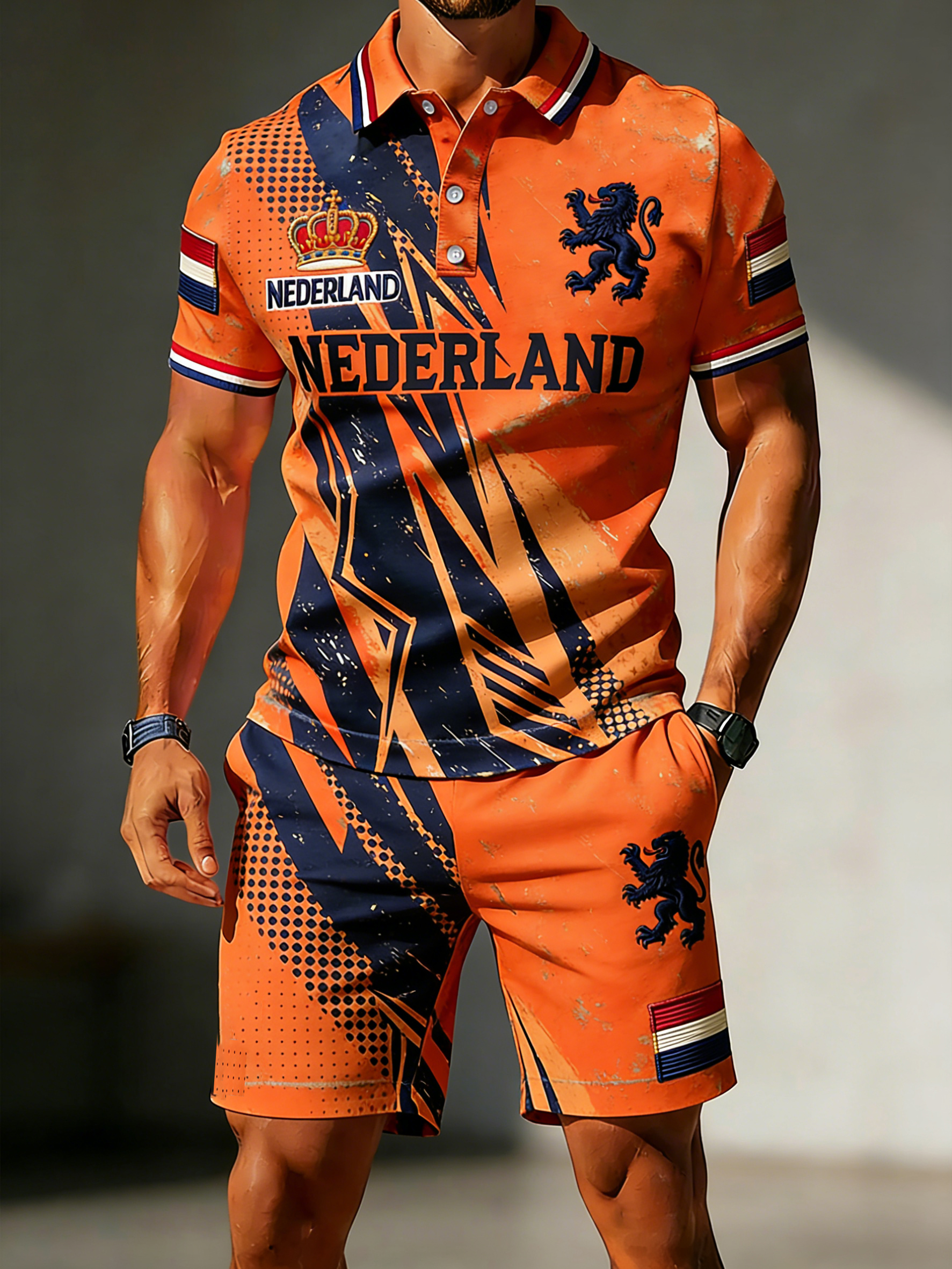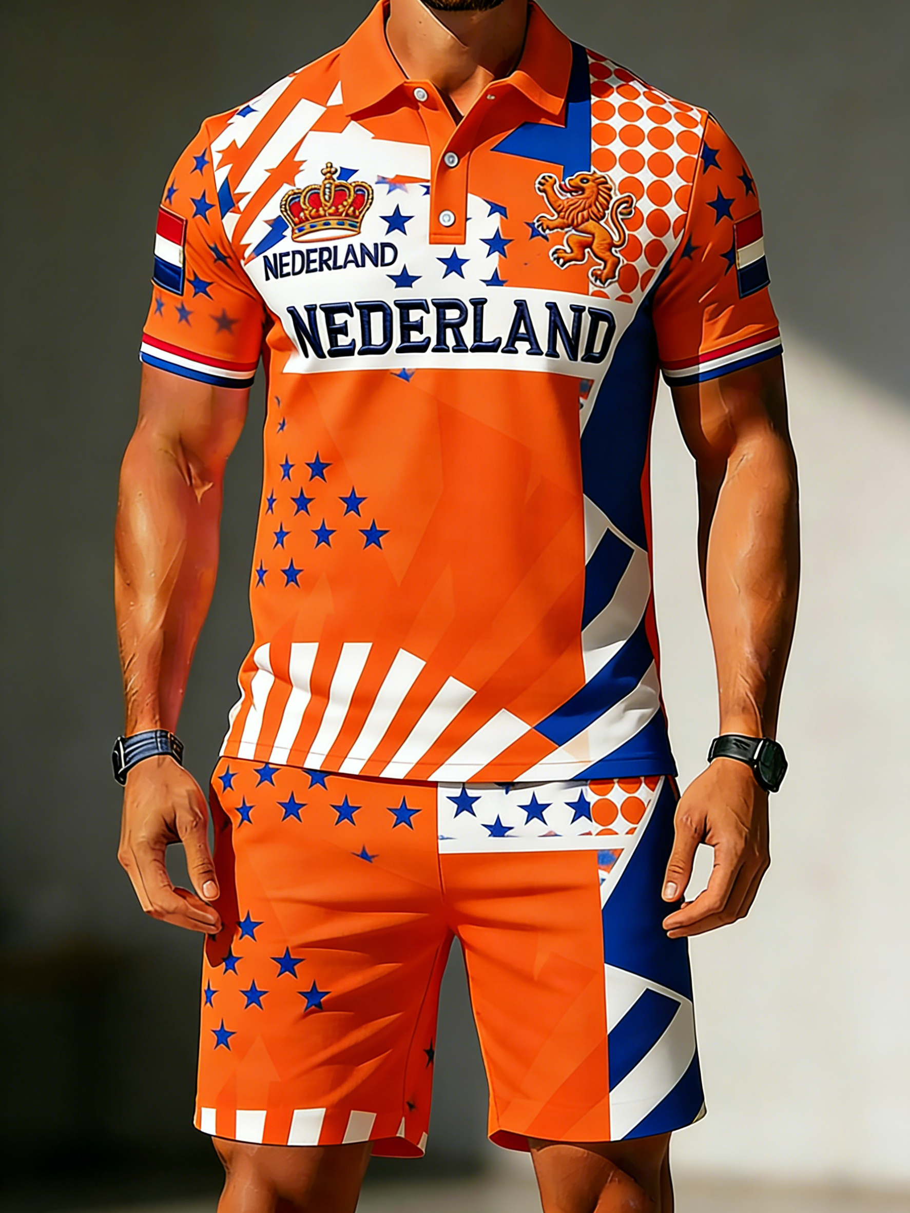 Herenpolo en korte broekset met print voor de Nederlandse Koningsdag, casual stylerei